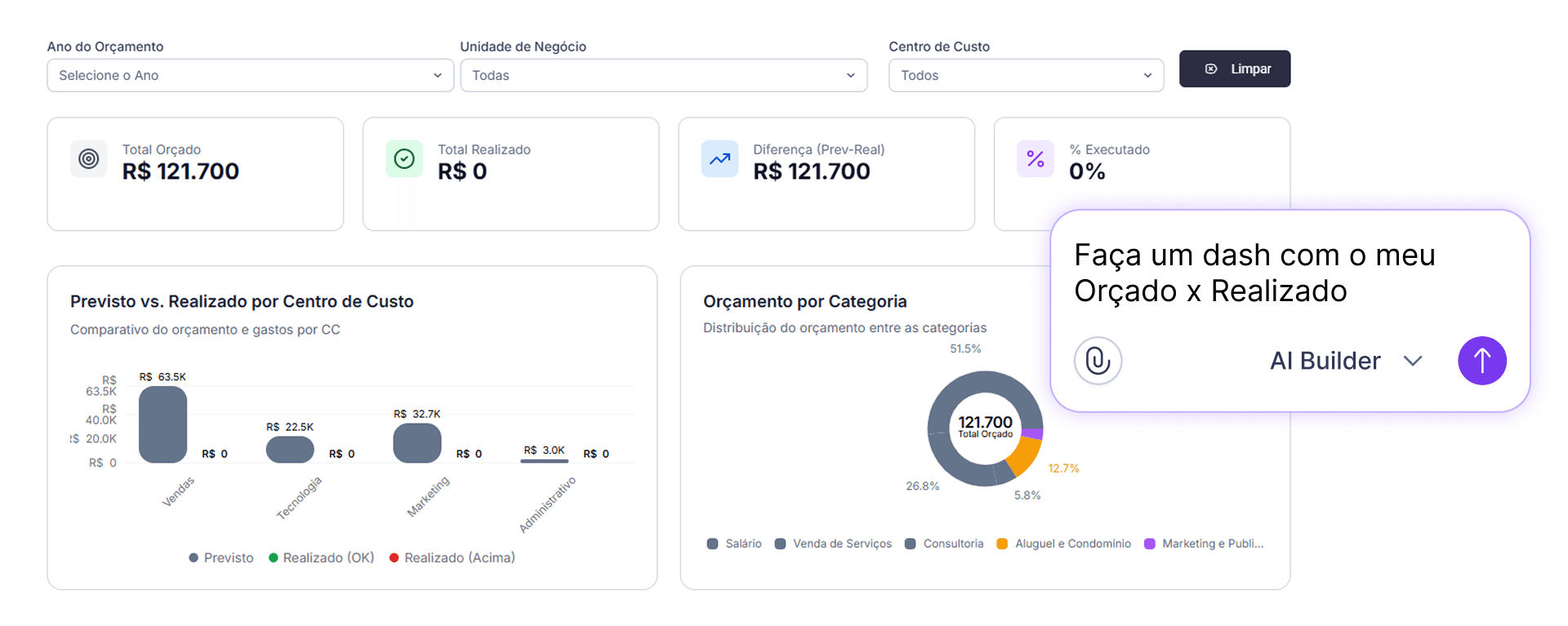 Quando o planejamento orçamentário deixa de acontecer em planilhas isoladas e passa a acontecer em um ambiente corporativo com IA, a lógica de trabalho muda completamente.