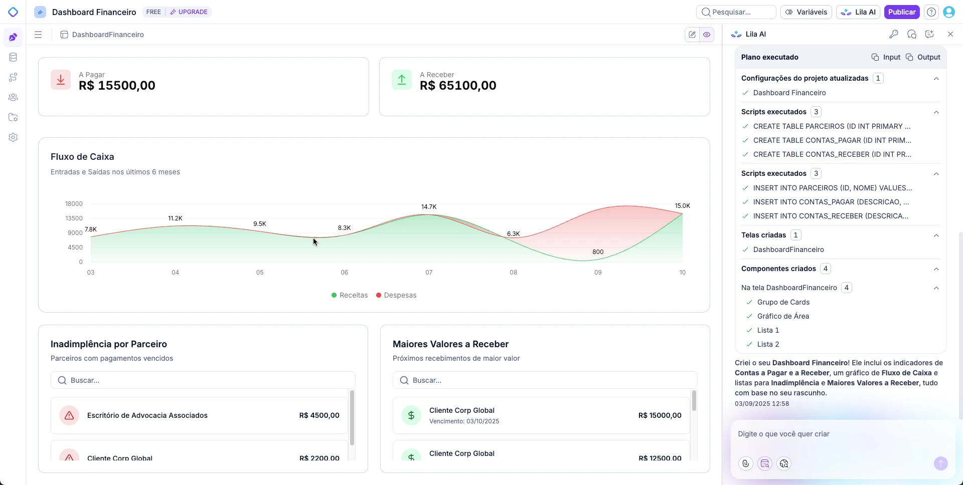 A lógica é simples e poderosa: você descreve o que precisa (um fluxo, um processo, um planejamento, um controle) e a IA constrói o sistema correspondente.